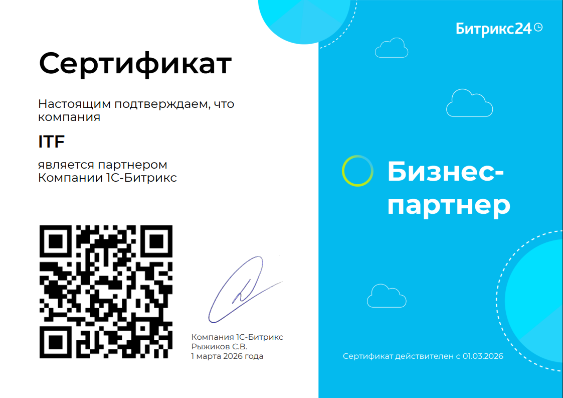 Компания ITF — Золотой партнёр Битрикс24 с более чем 20-летним опытом успешных проектов в IT.